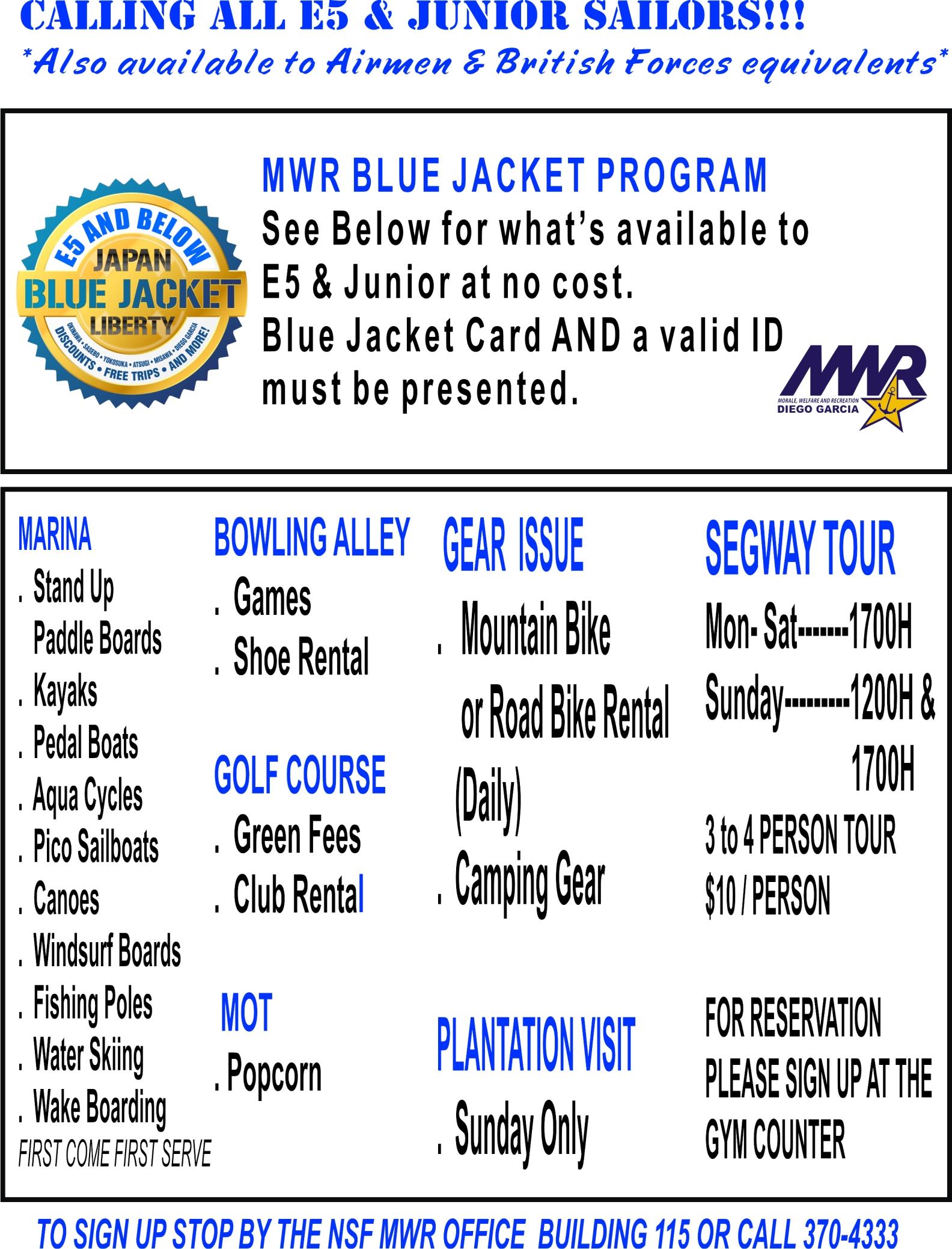 Calling all E5 and Junior Sailors! Diego Garcia MWR provides FREE gear rental for E5’s and Junior Sailors and FREE lessons to Sailing, Windsurfing, SUP and Powerboating, Swimming & Golf. Click here to see the complete list of free items and opportunities! To sign up, stop by the NSF MWR Office Building 115 or call 370-4333.